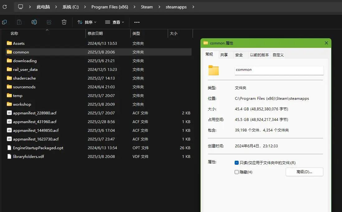 但在steamappscommon文件夹里,却躺着42个文件夹,说明之前安装过的游戏目录依然存在。