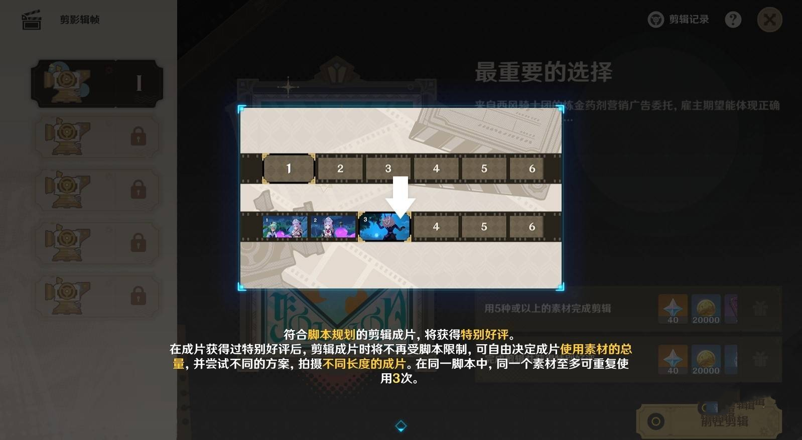 旅行者需根据活动提供的脚本选择合适的镜头素材进行剪辑。