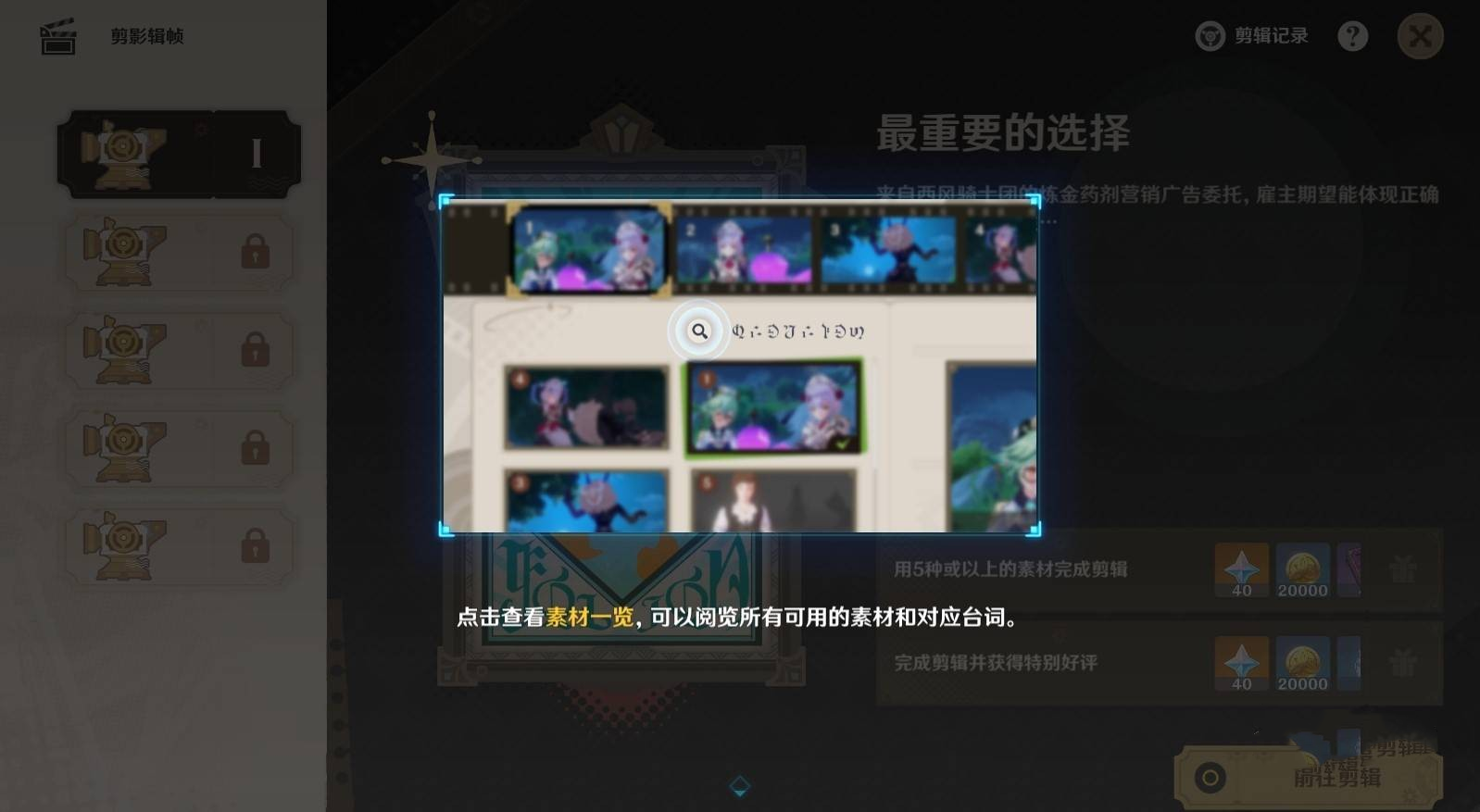 原神5.4剪影辑帧全关卡满奖励指南:原神5.4版本上线了全新的“剪影辑帧”创意剪辑活动,玩家将在活动中扮演广告导演,通过挑选合适的镜头素材,剪辑出符合脚本要求的短片,完成任务后可领取丰厚奖励。