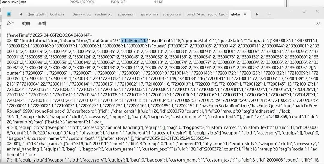 2、找到第二行中的 totalPoint,把冒号后面的数字改成你想要的命运点数量(比如 999)。