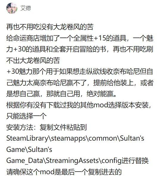 苏丹的游戏本身玩法就很耐玩,这些MOD只是锦上添花,让你在反复游玩时体验更丝滑更护肝。该探索的还是要探索,第一次玩建议还是原版慢慢品味,后续二周目三周目开起来,MOD绝对是你的好帮手!