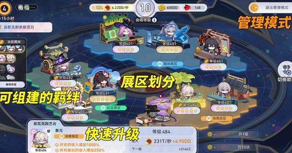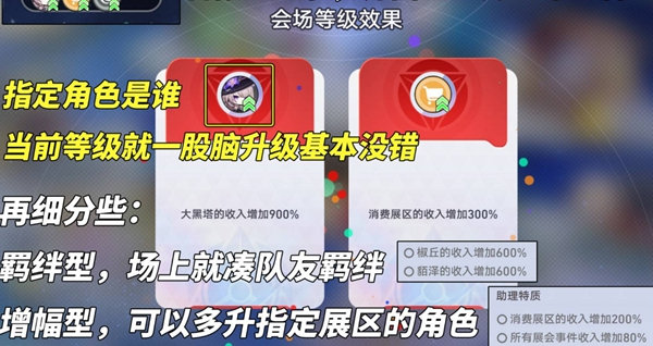 升级会场除了做任务,还需要金币支持。合理搭配展区角色、调整展台配置,让你的金币收入最大化!