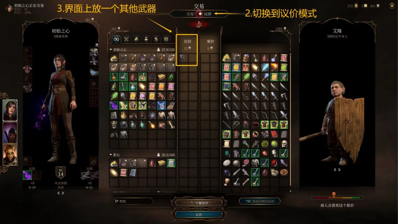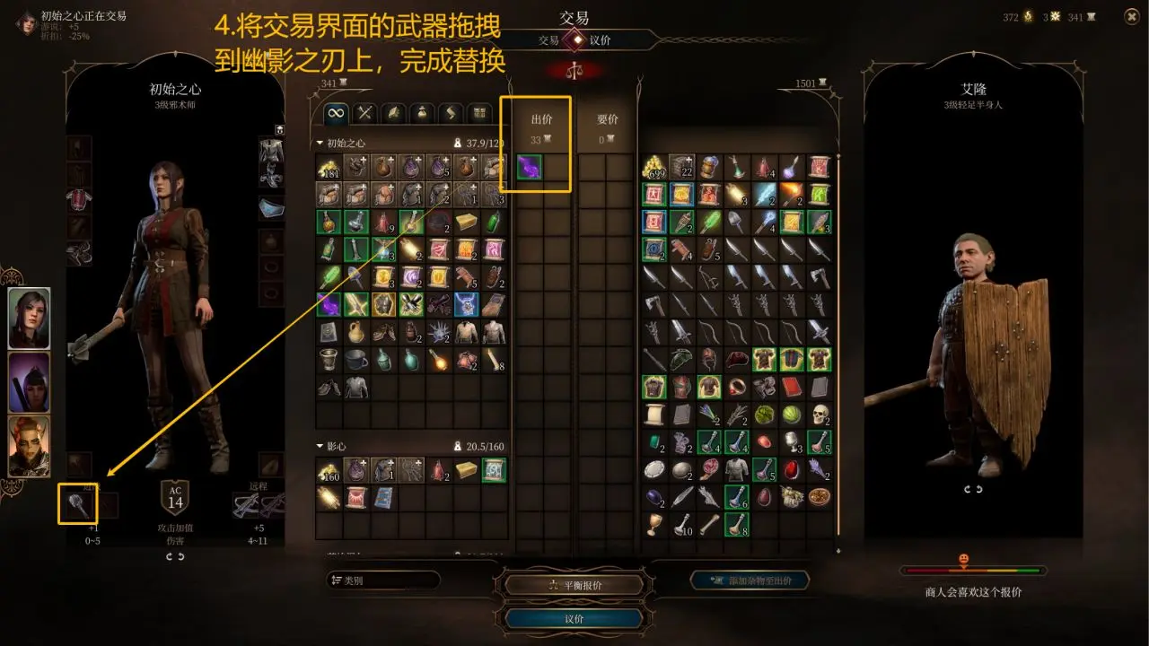 4、可以多次点击“议价”按钮,拉高态度,再进行0元购买,幽影之刃价值会略微提升(例如33金币 → 43金币);
