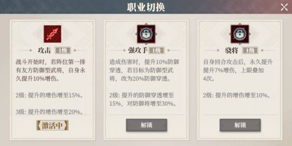 游戏中角色觉醒后大家就可以解锁天赋啦,每位玩家将根据武将的职业获得专属的天赋树,这些天赋树提供了多样化的战斗效果,在点亮天赋时玩家需要细心考虑武将的职业特性,以选择最合适的天赋路径,例如对于攻击职业的武将,其天赋可能包括在战斗开始时,如果阵位第一排有友方防御型武将,则自身永久提升10%的增伤效果,同时强攻手天赋还能在造成伤害时提升10%的防御穿透,若目标恰好是防御型武将,则防御穿透效果翻倍至20%。