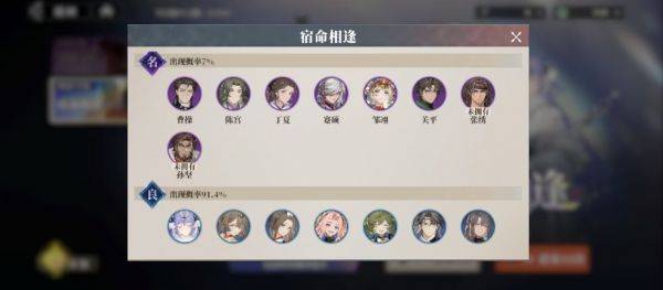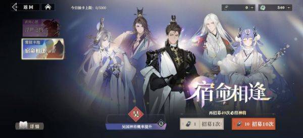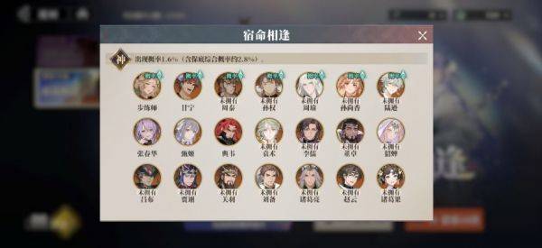 在常驻卡池宿命相逢中,当玩家发起招募时,不仅能收获100三山钱,还有机会将一名心仪的武将纳入麾下,就概率而言,神将的基础出现概率为1.6%,但游戏中贴心地设置了保底机制,使得神将的实际出现概率约提升至2.8%,名将的出现概率则相对较高,达到了7%,而良将的抽取概率更是令人惊喜,高达91.4%。为了全方位地保障玩家的利益,游戏还精心设立了保底规则。
