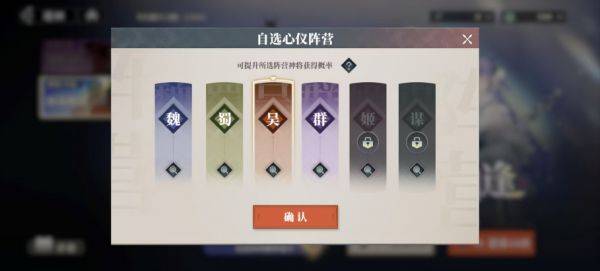 会提升至全部神将概率的50%,并且这一调整并不会对名将和良将的抽取几率产生影响,假如玩家这一次抽到的神将并非来自心仪阵营,那么下一次抽奖时,系统将会确保该神将来自体仪的阵营,目前游戏中开放了四大阵营供玩家选择,至于如何选择心意阵营,完全取决于玩家的个人喜好和战术布局,当前各个阵营都拥有不同类型的优秀武将。