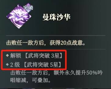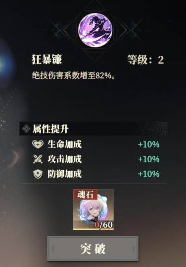 以张春华为例,当她突破到2级时,其狂暴镰技能的伤害系数将直接增至82%,而随着游戏进程的推进,武将的突破等级越高,技能效果的提升就越高,同时每个武将的突破技能都有着严格的解锁机制,比如张春华的独特突破技能曼珠沙华,只有当武将的突破等级达到三级时,这个技能才会解锁,为而当武将的突破等级一路攀升至5星时,玩家还将获得一次提升这个突破技能强度的机会。