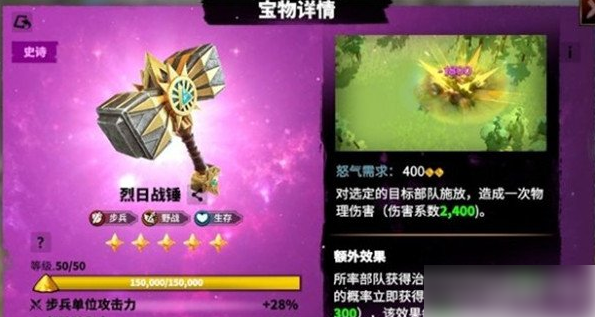 对于没有获取到传说宝物的玩家来说,烈日战锤是个不错的过渡选择,主动技能可以造成单体伤害的同时,额外效果还可以提供额外的治疗,效果不错。