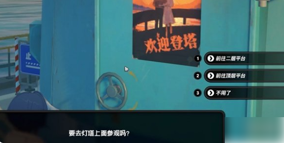 3、来到灯塔门前,与灯塔入口对话,选择前往顶层平台。