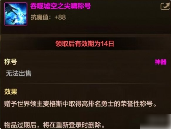 1、获取方法:世界boss麦格斯,伤害排名达到前3%。
