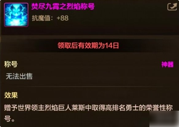 1、获取方法:世界boss烈焰巨人莱斯,伤害排名达到前3%。