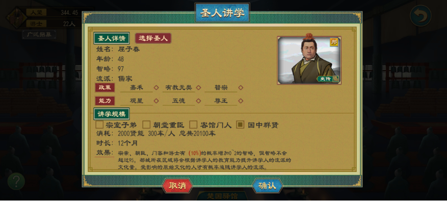 6.韵乐宫:使用讲学等方法将都城洗成儒家后,修建韵乐宫,可以瞬间进入圣人阶段