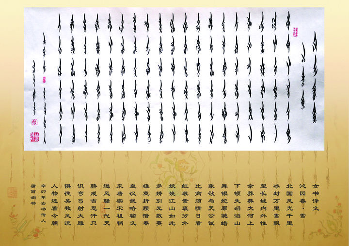 这种文字呈长菱形,字体秀丽娟细,造型奇特,基本单字共有1700多个,全部由妇女创造,只在女性之间传承使用,主要用于书写妇女的情感、生活故事等。