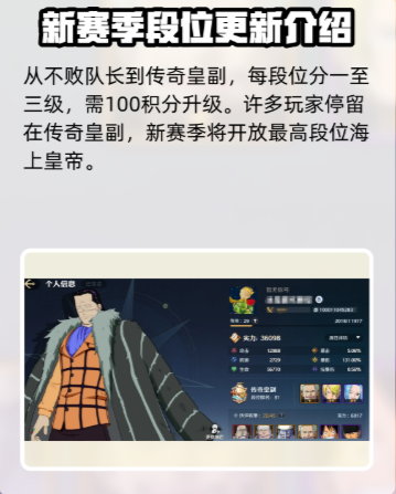 前期需要大家从不败队长赚积分到传奇皇副,在每个段位中,还有一到三级,再次获取足够积分才可以升级段位,而每个段位需要100积分进行升级,而目前很多玩家都是停留在传奇皇副这个段位上面,其实在新赛季开启的时候,就会出现这个海上皇帝段位了,也是大家最高可以获取的段位。