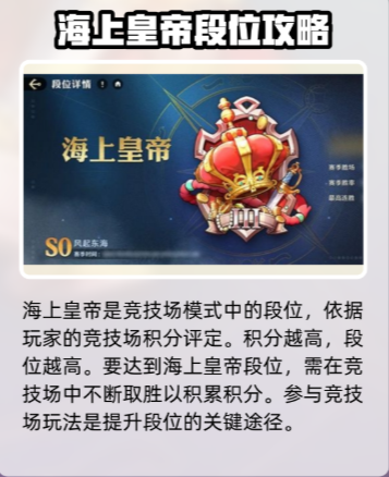 首先,大家需要去参与竞技场的玩法,因为海上皇帝是这个模式当中的一个段位,也是根据玩家的竞技场积分来评定的,积分越高,大家的段位就越高,因此,要想达到海上皇帝段位,就需要在竞技场中不断取得胜利,积累积分。