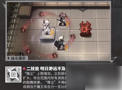 “微尘”上限增加,立刻获得数枚“微尘”,“微尘”旋转半径扩大,攻击范围内所有其他友方单位获得相当于魔王一定攻击力的鼓舞效果,“微尘”不再碰撞友方干员,碰撞到敌方单位时造成相当于魔王攻击力一定比例的真实伤害,并使目标束缚数秒