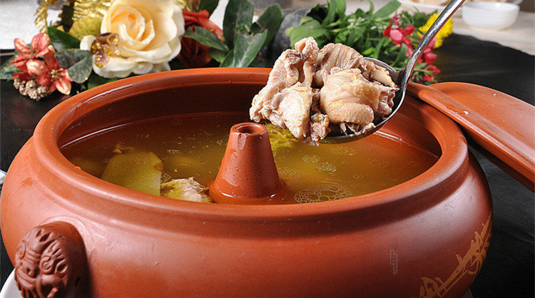 汽锅鸡是云南建水的传统名菜,其制作技艺已被列入省级非物质文化遗产。它用特制的陶制汽锅——锅底有中空汽管,蒸汽从底部上升,通过汽管进入锅膛,将鸡肉蒸熟。全程不加一滴水,全靠蒸汽凝结成汤汁,最大限度保留了鸡肉的原汁原味。这种独特的“汽蒸”技法,融合了建水紫陶工艺与滇南饮食智慧,是云南地理风物的味觉表达。而叫花鸡是江苏常熟的传统名菜,以荷叶包裹、黄泥糊烤为特色,属于苏菜系,与云南无关。