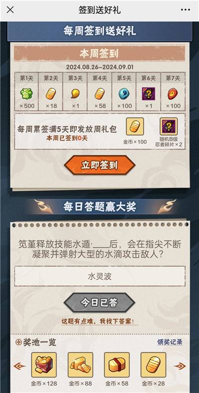 在忍者手游大全'>火影忍者手游的微信公众号中每天都会有火影忍者手游相关的每日问答活动,玩家成功答对答案即可领取游戏中的道具奖励。为各位玩家带来《火影忍者手游》今日微信公众号答题分享。今天的题目会是什么样的呢?本文将和大家分享正确答案,让还不清楚的玩家也能受益。赶快来看看吧!那么2024年8月26日今天的题目会是什么样的呢?本文将和大家分享正确答案,让还不清楚的玩家也能受益。赶快来看看吧!
