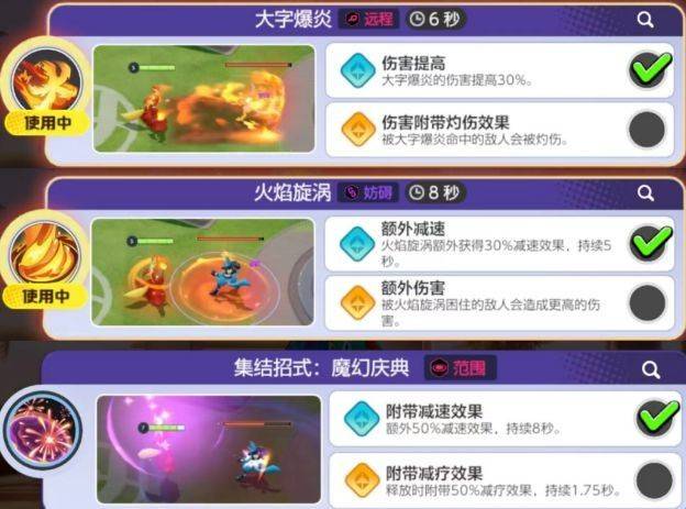 火焰旋涡会对敌人造成多段伤害并让敌人无法动弹,而蓄能焰袭则更灵活,可以优先攻击血量最低的宝可梦,非常适合抢人头。