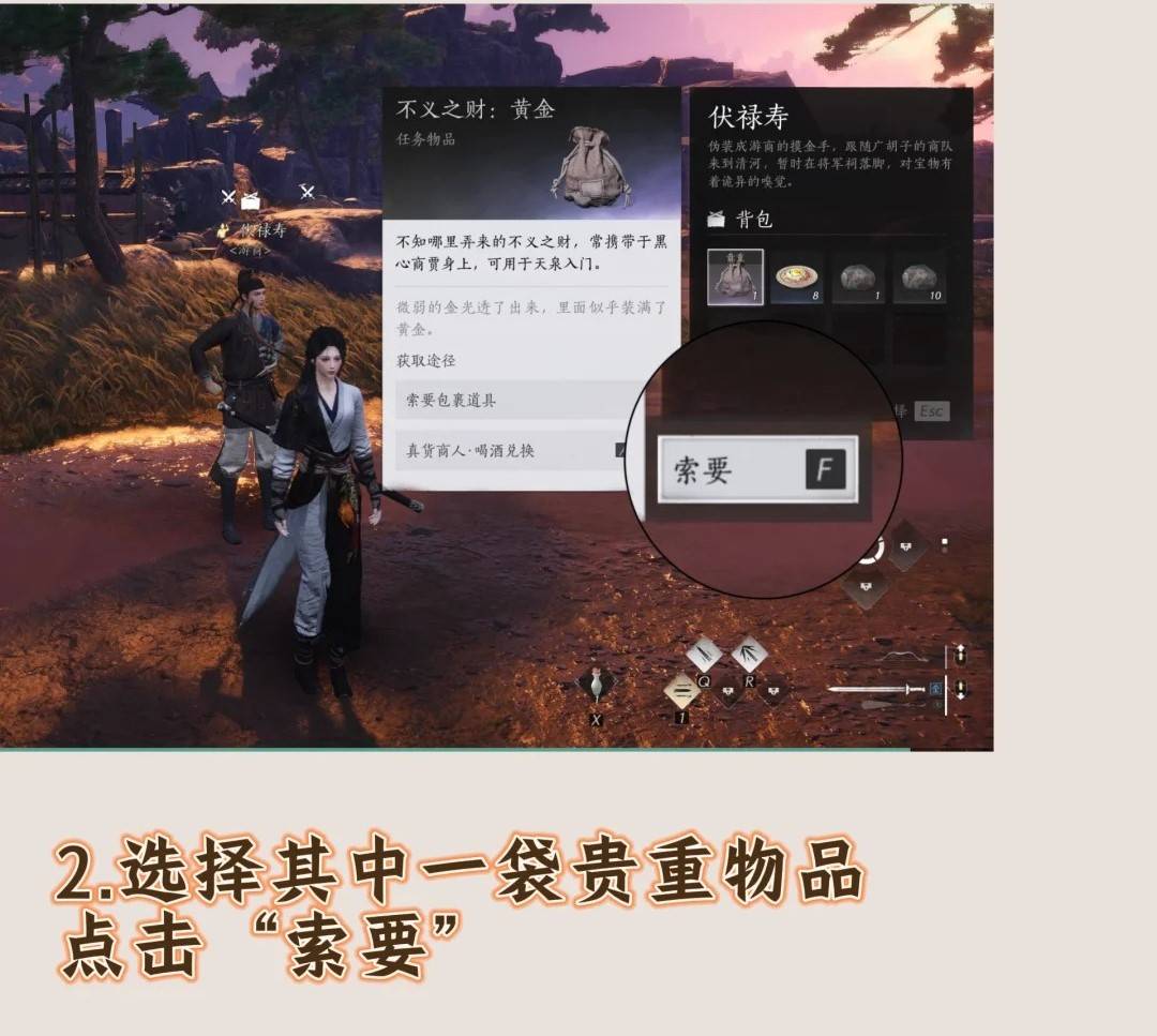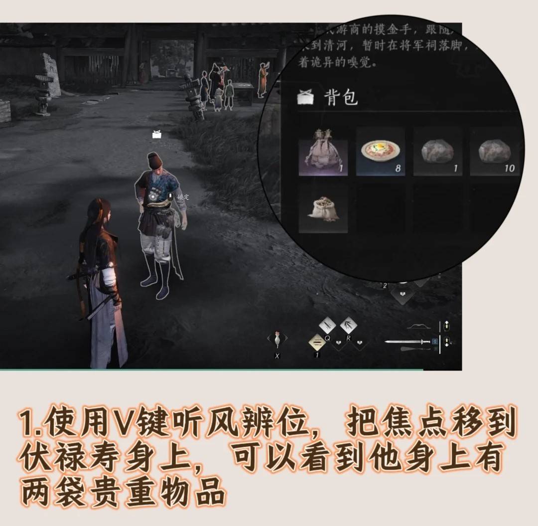 >对伏禄寿使用技能:对准伏禄寿,使用听风辨位(V键),可以看到他身上有两袋贵重物品,选择其中一袋点击索要。