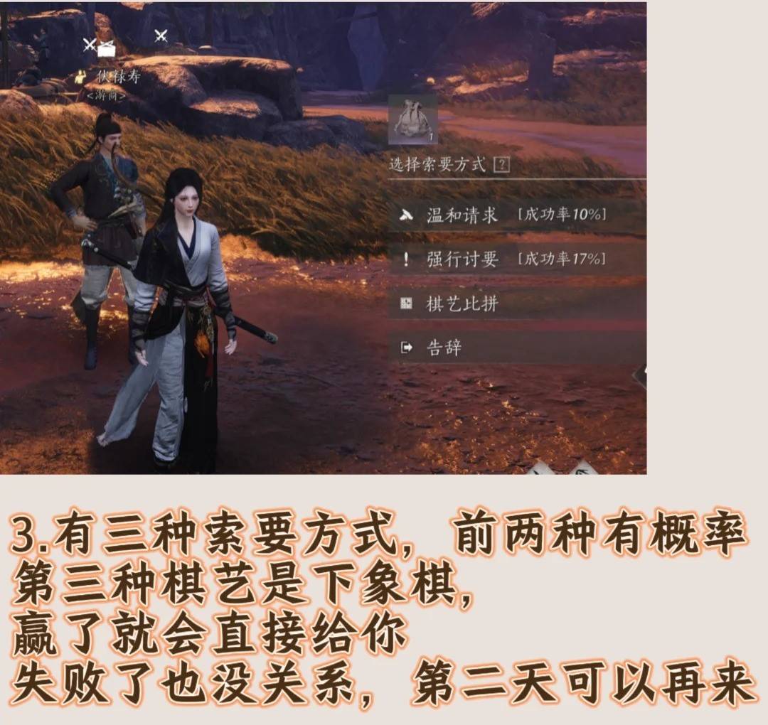 >选项解锁:在索取过程中,有三种索取方式,如果选择温和方式,可以解锁下棋的好感选项(失败了可以第二天再来赢了能获得贵重物品),一步步与伏禄寿建立友好关系。
