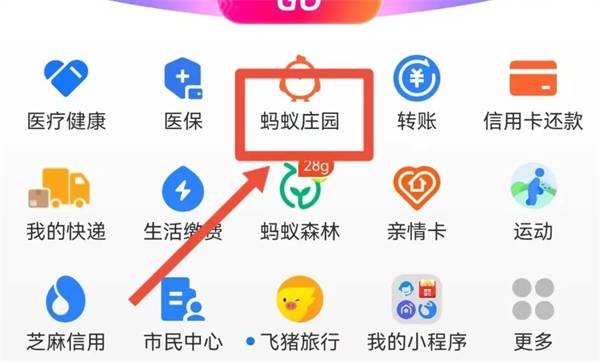 1、打开支付宝,在首页点击【蚂蚁庄园】图标;