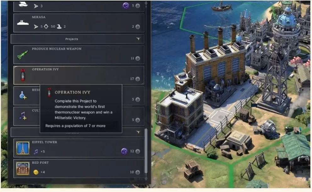 2、当你的军事遗产进入现代阶段,你将解锁曼哈顿计划,这将为你的文明提供第一枚核武器。