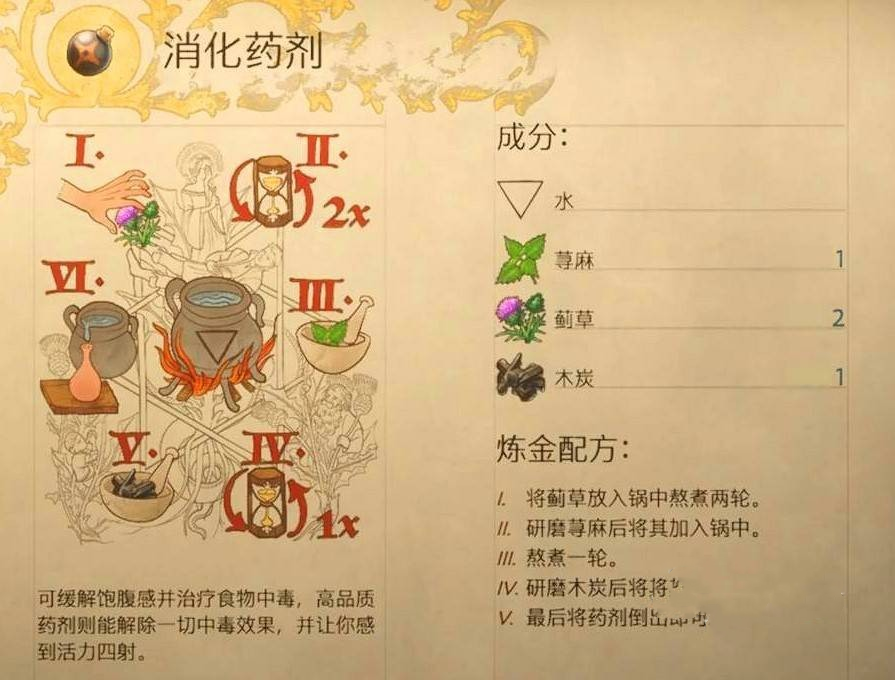 消化药剂可以立即治愈食物中毒,但会降低角色的营养值。