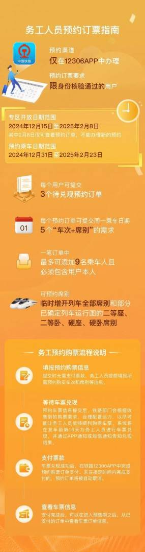 据介绍,2024年12月15日至2025年2月7日,已通过实名制核验的务工人员可在铁路12306手机客户端“务工人员春运预约购票服务”专区,预约购买2024年12月31日至2025年2月23日的火车票,同一账户*多可同时提交3个订单,每个订单可添加1个乘车日期的5个“车次 席别”的组合,*多可为包含本人在内的9名旅客预约。