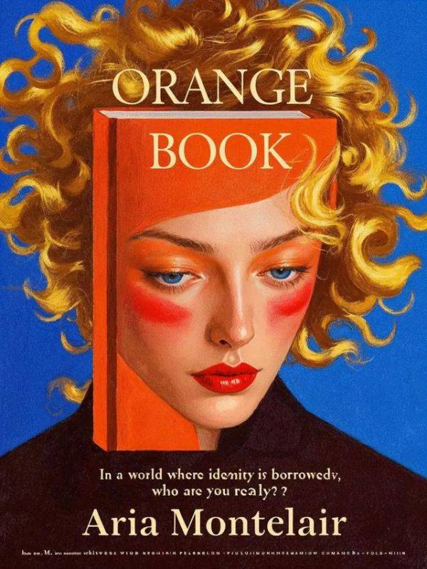 ▲ Prompt:一本鲜艳的橙色书籍代替了人物的头部,书的封面上是超现实未来感的人脸,环绕书籍的是夸张的金色卷发,为画面增添了一丝戏剧性。