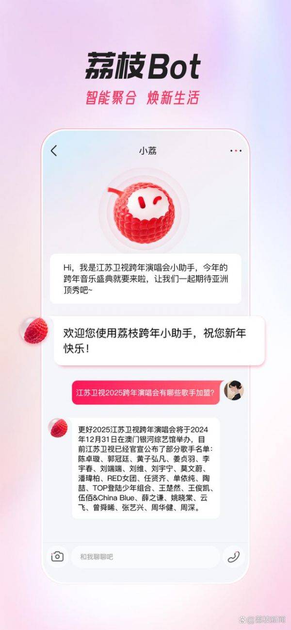 跨年演唱会之后,《*强大脑12》《ai荔枝·新春脑力局》《幸福合家欢2025江苏卫视春节联欢晚会》《2025江苏卫视元宵晚会》《打歌2025》《音乐缘计划2》等节目,也将在江苏卫视与“ai荔枝”双平台同步上线播出。