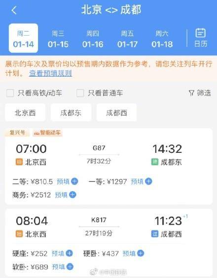 12月30日,铁路12306(含网站、手机客户端)进一步优化购票信息预填服务,开设“购票信息预填优化试点”专区,在北京市、天津市、上海市、江苏省、浙江省、广东省各车站往返四川省、重庆市各车站始发终到列车的长途区段车票发售中,在购票信息预填的基础上,试点推出“系统自动提交购票订单”功能,旅客朋友可预填购票信息并预支付票款,铁路12306将根据旅客设定自动为其提交订单,使购票更加便捷。