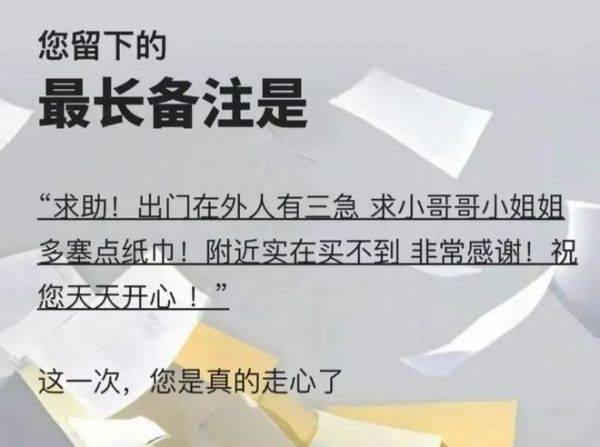 比如,网友小卷的*长备注是:求助,出门在外人有三急,求小哥哥小姐姐多塞点纸巾,附近实在买不到。