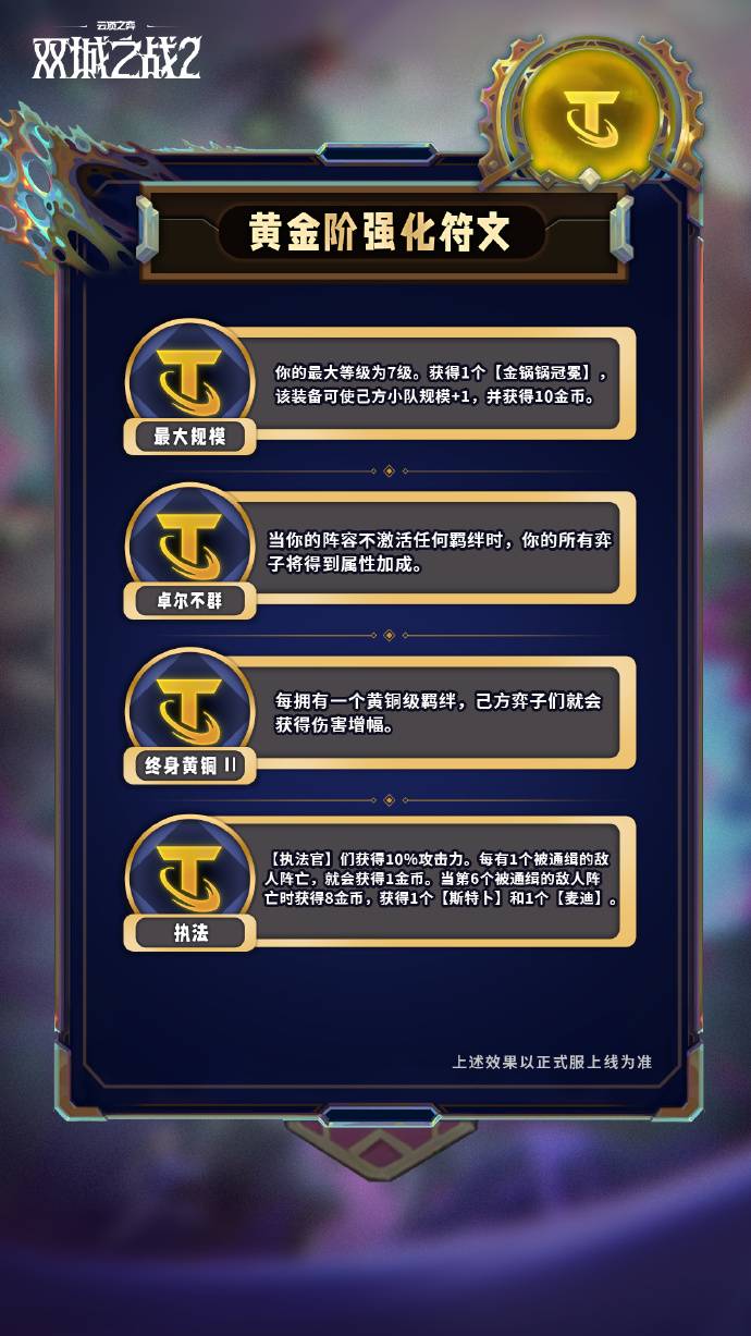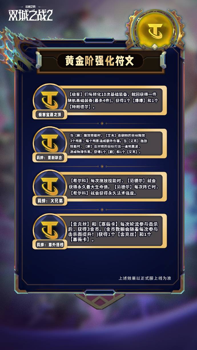 云顶之弈即将迎来S13赛季双城之战2,在这个赛季将会上线全新的黄金阶强化符文,那么大家知道黄金阶强化符文究竟是怎么样的呢?下面快跟随多特小编为大家带来的云顶之弈S13黄金阶强化符文吧。