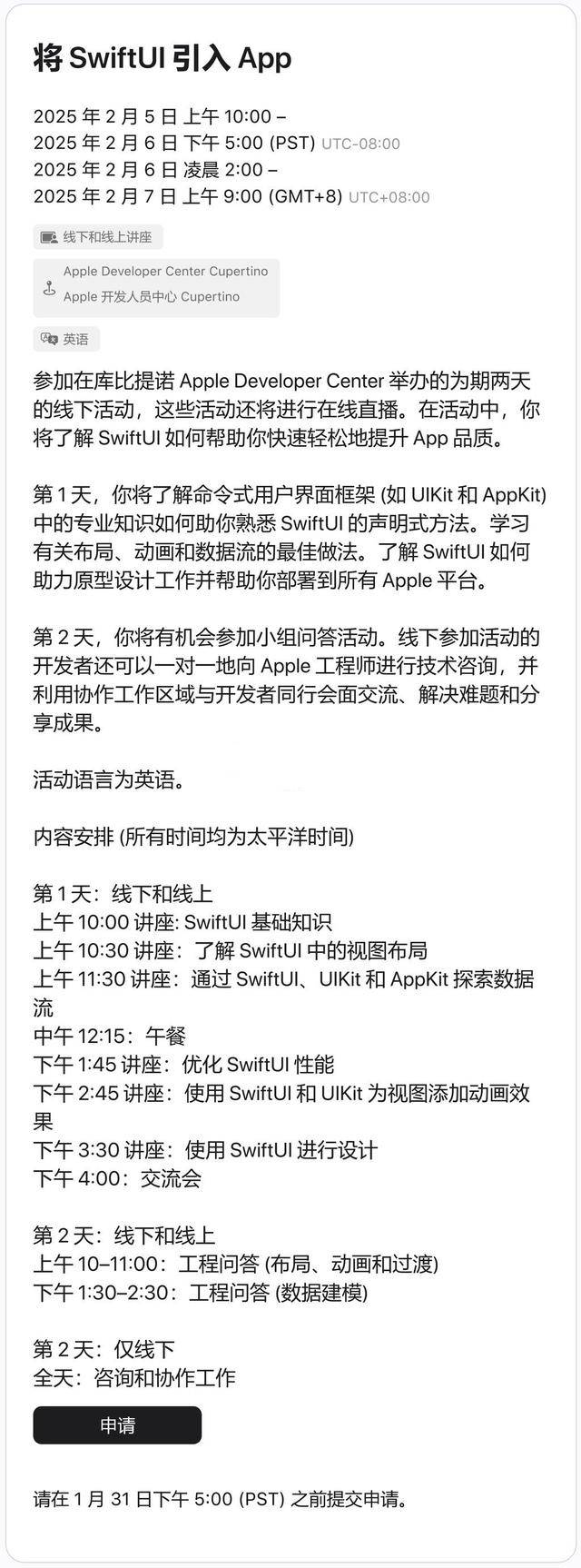 1 月 8 日消息,苹果公司宣布将于北京时间 2 月 6 日凌晨 2 点到 7 日上午 9 点,在苹果库比提诺 Apple Developer Center 举办为期 2 天的“将 SwiftUI 引入 App”线下活动,并同步在线直播。