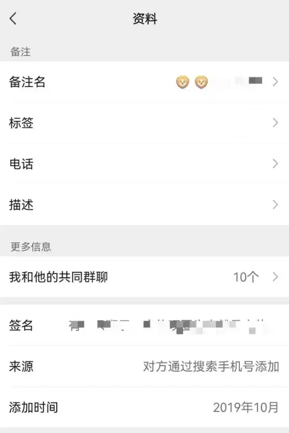 其中,备注包括:备注名、标签、电话、描述;更多信息包括:我和他的共同群聊、签名、来源、添加时间。