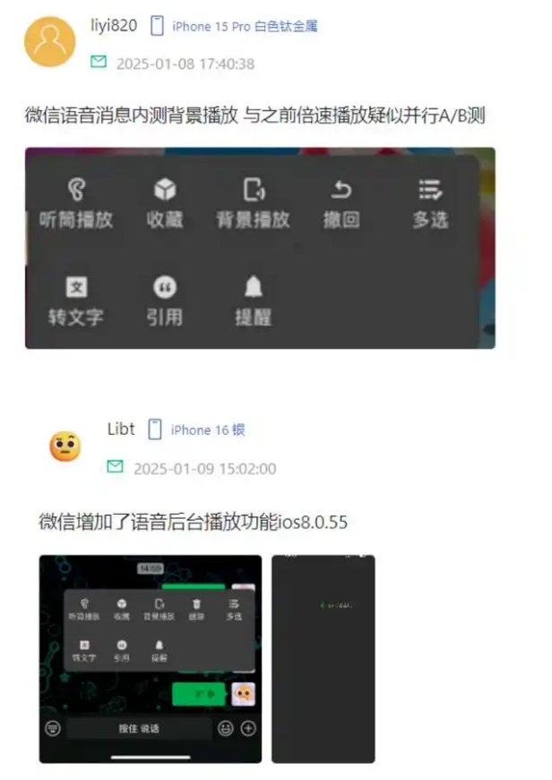 从两位家友晒出的截图来看,长按语音消息,弹出的选项中新增“背景播放”,点击后语音将挂在后台播放。