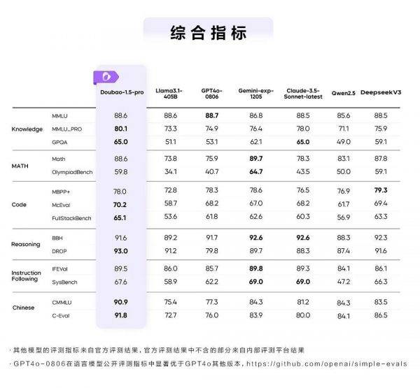 字节跳动旗下豆包大模型 1.5 Pro 近日正式发布,全新 Doubao-1.5-pro 模型增强了综合能力,在知识、代码、推理、中文等多个测评基准上,综合得分优于 GPT-4o、Claude 3.5 Sonnet 等模型。