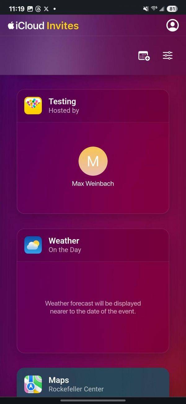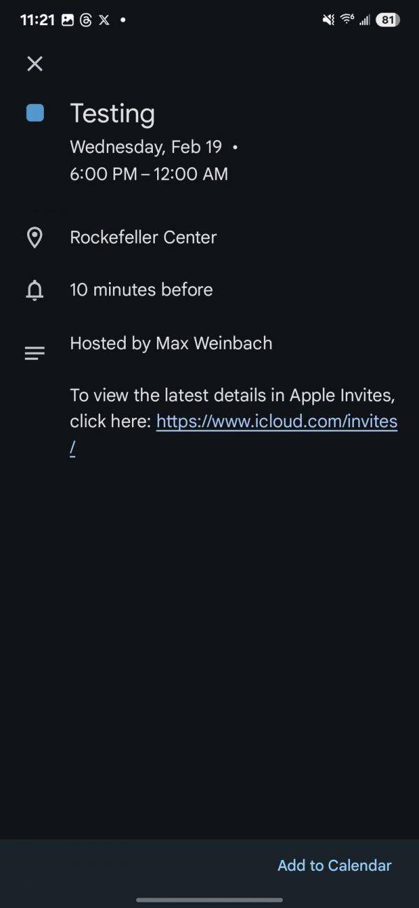 其中一个问题是,由于安卓系统没有 Apple Invites 应用,用户可以选择下载日历事件文件并添加到自己的日历应用中。