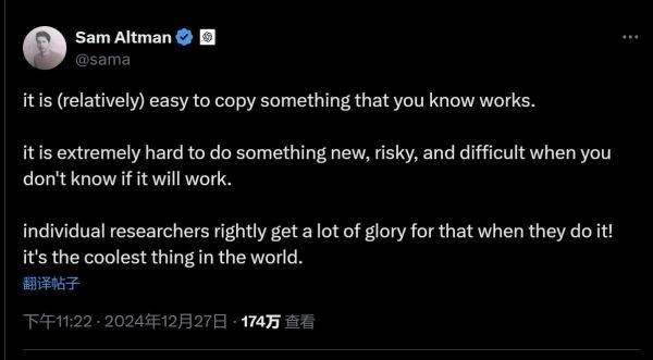 阿尔特曼也表示:“复制已有的东西容易,但创新却很难。”