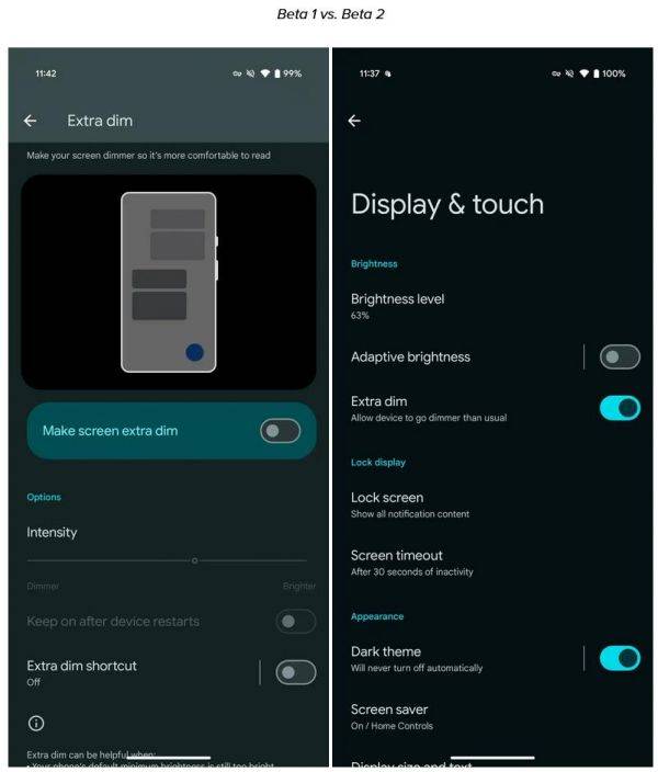 在“显示和触控”设置中移除了“Extra dim”自定义选项。