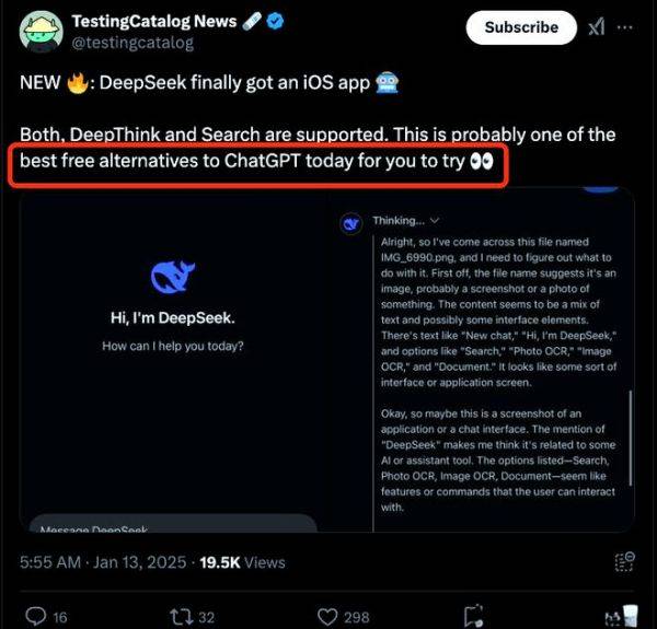 这款DeepSeek官方App自上线以来,便凭借其卓越性能和免费特点,赢得了网友们的*好评,甚至被誉为ChatGPT的*佳替代品之一。尽管目前仅推出了iOS版本,但网友们已经迫不及待地期待其安卓或iPad版本的早日发布。