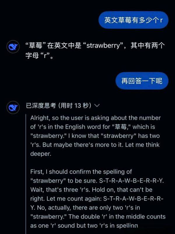 接着,我们再来探讨一个备受关注的话题:单词“Strawberry”中究竟有多少个字母“r”。尽管它尝试进行深入分析,但最终仍未给出确切答案。