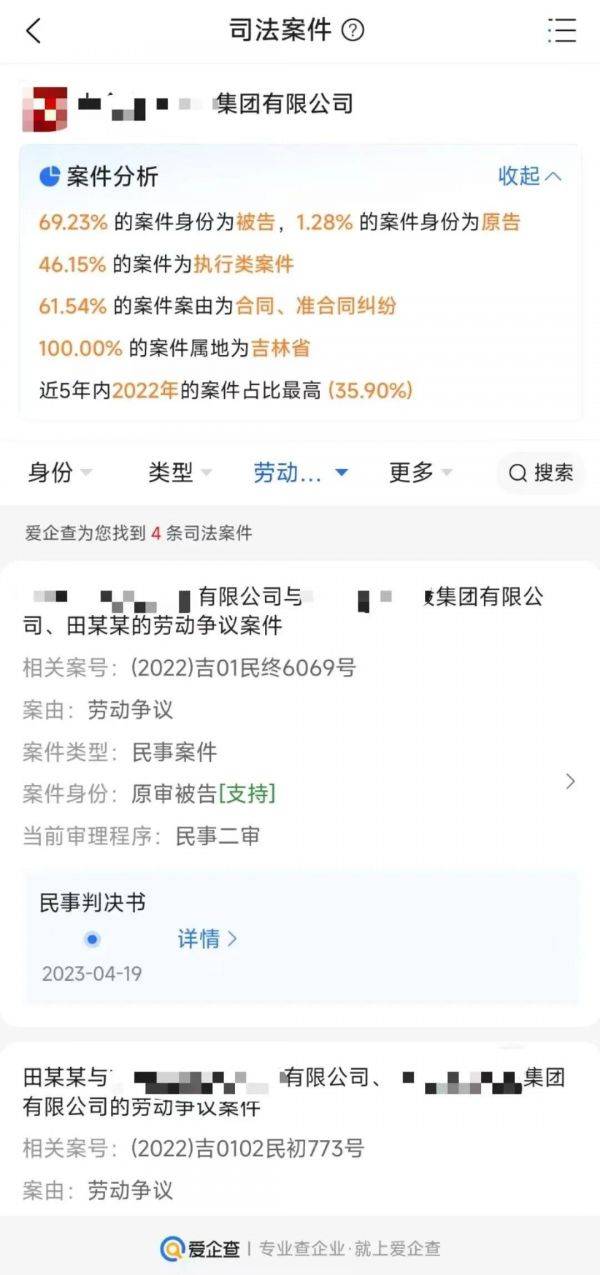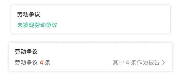 「劳动争议」方面,目标企业的劳动争议类司法案件,都能集合展示在「劳动争议」这一查询维度下。劳动争议相关风险提示,也分为两种情形:若提示企业存在“劳动争议x条”,点击提示信息也能查看与之相关的全部司法案件信息。