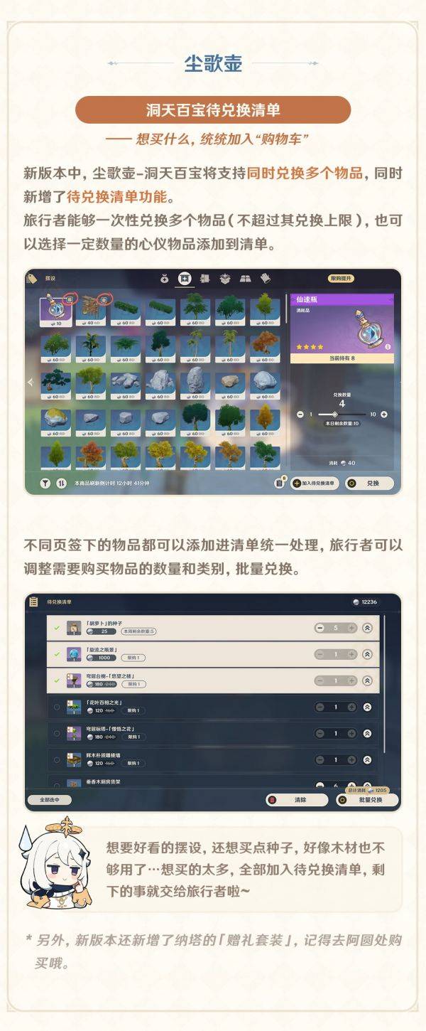 新版本中,尘歌壶-洞天百宝将支持同时兑换多个物品,同时新增了待兑换清单功能。