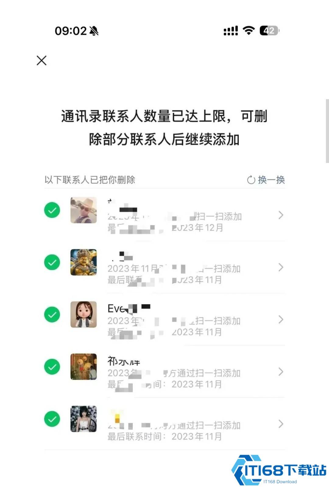 微信通讯录好友数量达到10000人上限后,系统会自动推送「已把你删除的联系人」列表。点击界面底部的蓝色「前往清理」按钮,屏幕会出现「推荐删除人」页面。