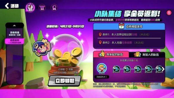 不仅如此,游戏还推出了回馈玩家的组团返利活动。玩家可以通过达成资格裂变条件后(达成一定的游戏进度或者进行任意数额的充值)可以成为队长建立返利团队,并邀请好友一起加入队伍。团队内,只要有成员充值,所有成员都可以获得等额返利,每个玩家最多可以获得680点券的返利总额。