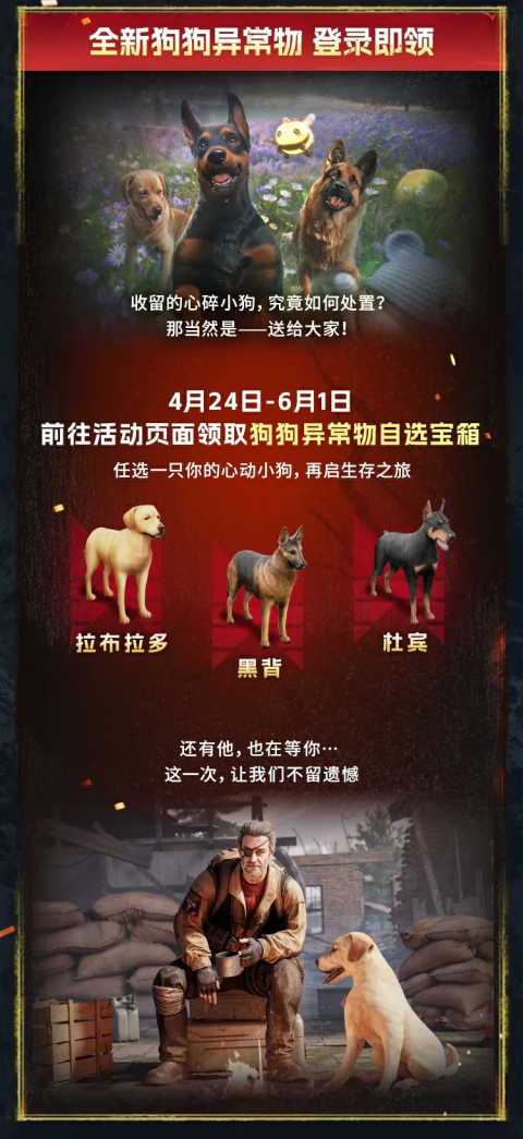 免费领取伙伴:登录游戏即可前往活动页面领取「狗狗异常物自选宝箱」,杜宾、拉布拉多、黑背等品种任选,每只小狗都有独特外观与互动动作;