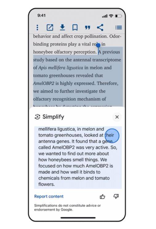 据悉,Simplify 依托谷歌 Gemini AI 模型,由 Google Research 开发,目的是让专业术语变得易于理解,同时不牺牲重要信息。例如,在医学报告或学术期刊中,Simplify 能清楚解释诸如“肺气肿”(一种损伤肺部气囊的疾病)和“纤维化”(身体在受损后生成的瘢痕或致密组织)等术语,用户无需再另外查找资料。