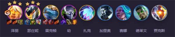 泽丽(主C)+ 瑟庄妮(控制核心)+ 雷克顿(主坦)+ 劫(副C)+ 扎克/加里奥(双堡垒)+ 赛娜(光环辅助)+ 德莱文(后期补强)+ 贾克斯(破甲工具人)